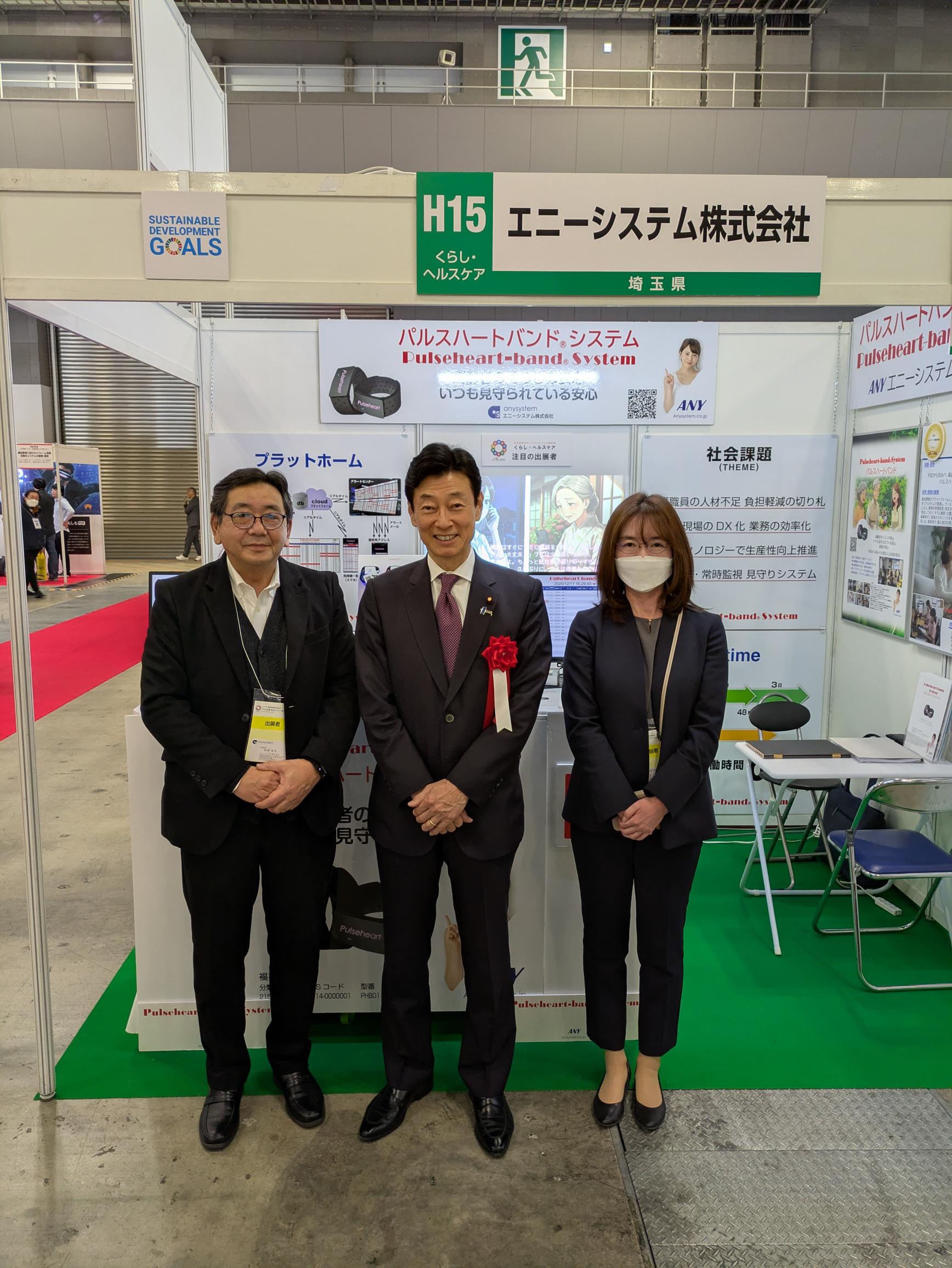 本日開催された展示会において、自由民主党 衆議院議員(元経済産業大臣)西村康稔氏が当社ブース(H-15)に立ち寄られ、当社製品「パルスハートバンド」にご関心をお寄せいただきました。